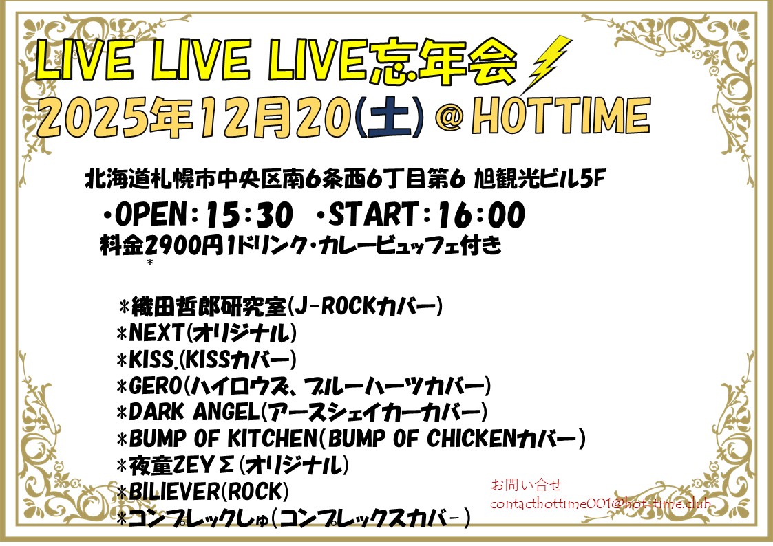 | 寺沢功一 札幌マンツーマンベースレッスン 13:00 寺沢功一 札幌マンツーマンベースレッスン 11月 3 @ 13:00 ![]() 急遽決定!!ご希望の方は、メッセンジャーでも受付ます! 札幌マンツーマンベースレッスン ロックベーシスト寺沢功一が札幌でマンツーマンのベースレッスンを行います。募集人数は4名です。ご応募お待ちしています! 【日程】 2025年11月3日(月:祝) 【場所】 札幌ホットタイム 札幌市中央区南6条西6丁目第6 旭観光ビル5F TEL 011-522-8775 【時間】 13時〜(決定しました)、14時〜、15時〜(決定しました)、16時〜 ※募集人数は4名までです。 【料金】 6,000円 / 50分 【予約メールアドレス】 下記のアドレスに、お名前、電話番号を明記して送ってください。締切は11/3の午前11時までです。 ticket.tera@gmail.com | LIVE LIVE LIVE 17:45 LIVE LIVE LIVE 11月 9 @ 17:45 ![]() オープン17:45 スタート18:10 お客様1700円1ドリンク付き 出演者2300円2ドリンク付き 出演 *fuzzy momentum(age factoryカバー) *くるりコピー(仮)(くるりカバー) *PINK TEDDY(ジュディマリカバー) *L-Ciel(ルシエル)(L’Arc〜en〜Cielカバー) *Secret of my heart(J-Popカバー) お問い合わせはcontacthottime001@hot-time.club にメールお願いします | |||||