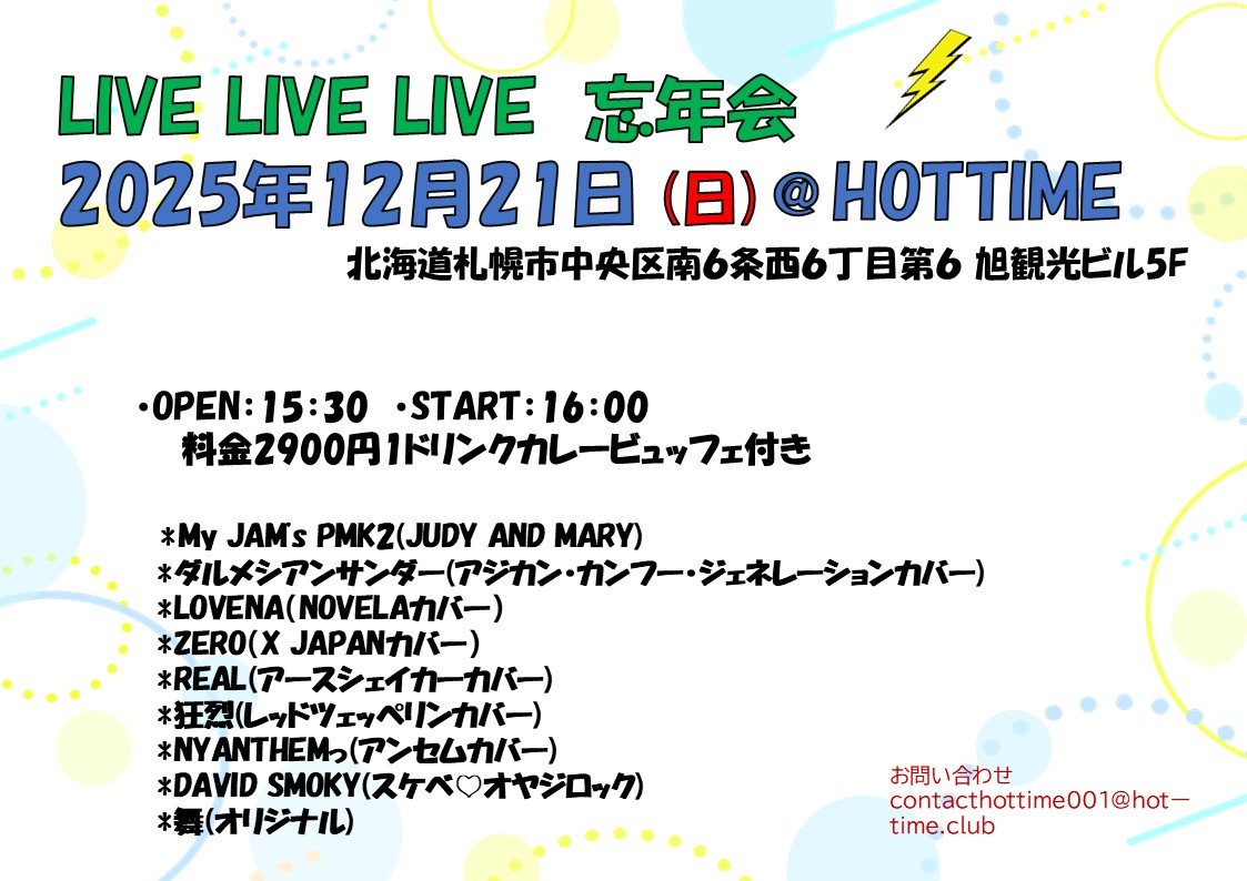 | DAISUKI!!J-POP・J-ROCK ライブ 00:00 DAISUKI!!J-POP・J-ROCK ライブ 11月 15 @ 00:00 ![]() DAISUKI!!J-POP・J-ROCK ライブ オープン16:00 スタート16:30 出演 *Pleasure’z(B’zカバー) *Livacro(J-POPカバー) *Locus(J-POPカバー) *コンプレックしゅ(コンプレックスカバー) *ダルメシアンサンダー(アジカン・カンフー・ジェネレーションカバー) *Emotion(カッツェカバー) *PINK TEDDY(ジュディマリカバー) *グレア(相川七瀬カバー) 出演者お客様ともに2500円 1ドリンク付きカレービュッフェ付き お問い合わせは contacthottime001@hot-time.club にメールお願いします | LIVE LIVE LIVE 17:00 LIVE LIVE LIVE 11月 16 @ 17:00 ![]() オープン17:00 スタート17:30 お客様1700円1ドリンク付き 出演者2300円2ドリンク付き 出演 *ADAMS ROCKS」(ブライアン・アダムス) *ミステイク承知の助(YUKIカバー) *late bloom(Jロックカバー) *ARCOIRIS(L’Arc〜en〜Cielカバー) *DAVID SMOKY(スケベ♡オヤジロック) *クグエヒデノリ お問い合わせはcontacthottime001@hot-time.club にメールお願いします | |||||