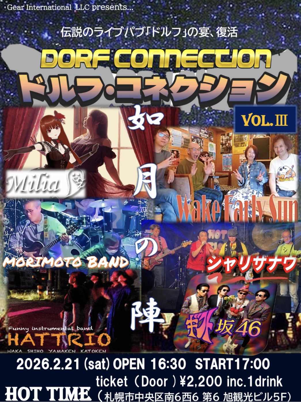 | Akihito Kinoshita Birthday Party 65 18:00 Akihito Kinoshita Birthday Party 65 1月 10 @ 18:00 ![]() Akihito Kinoshita Birthday Party 65 2026年1月10日(土) 開場18:00 開演18:30 料金¥3,500(1D別) カレービュッフェ付き 食べ物一品持ち込み可です! 会場 HOT TIME 札幌市中央区6条西6丁目 第6旭観光ビル 5F ・TIGET予約 TIGET予約 https://tiget.net/events/446678 ・お問い合わせHOT TIME contacthottime001@hot-time.club | LIVE LINE LIVE 16:30 LIVE LINE LIVE 1月 11 @ 16:30 ![]() オープン16:30 スタート17:00 2200円1ドリンク付き 出演 *CoolCheckers(チェッカーズカバー) *WALL(アースシェイカーカバー) *Add Bad Cast(Acid Black Cherryカバー) *Project-Rush(Rushカバー) *LOVENA(NOVELAカバー) *DAVID SMOKY(スケベ♡オヤジロック) *Readerle(オリジナルハードロック) お問い合わせはcontacthottime001@hot-time.club にメールお願いします | |||||